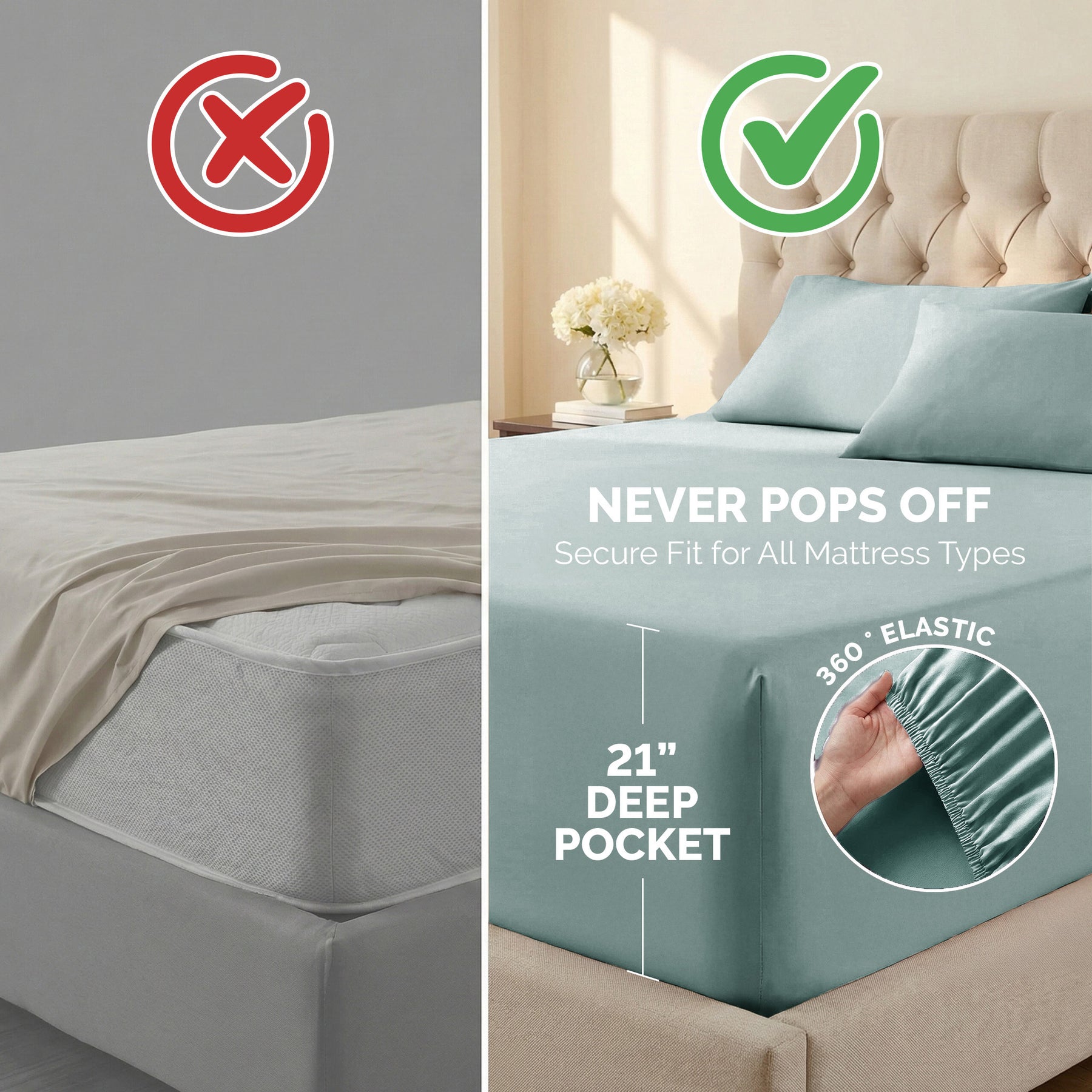 • Our fitted sheet offers an extra-deep pocket depth of 21-inches, allowing it to securely fit most mattresses
