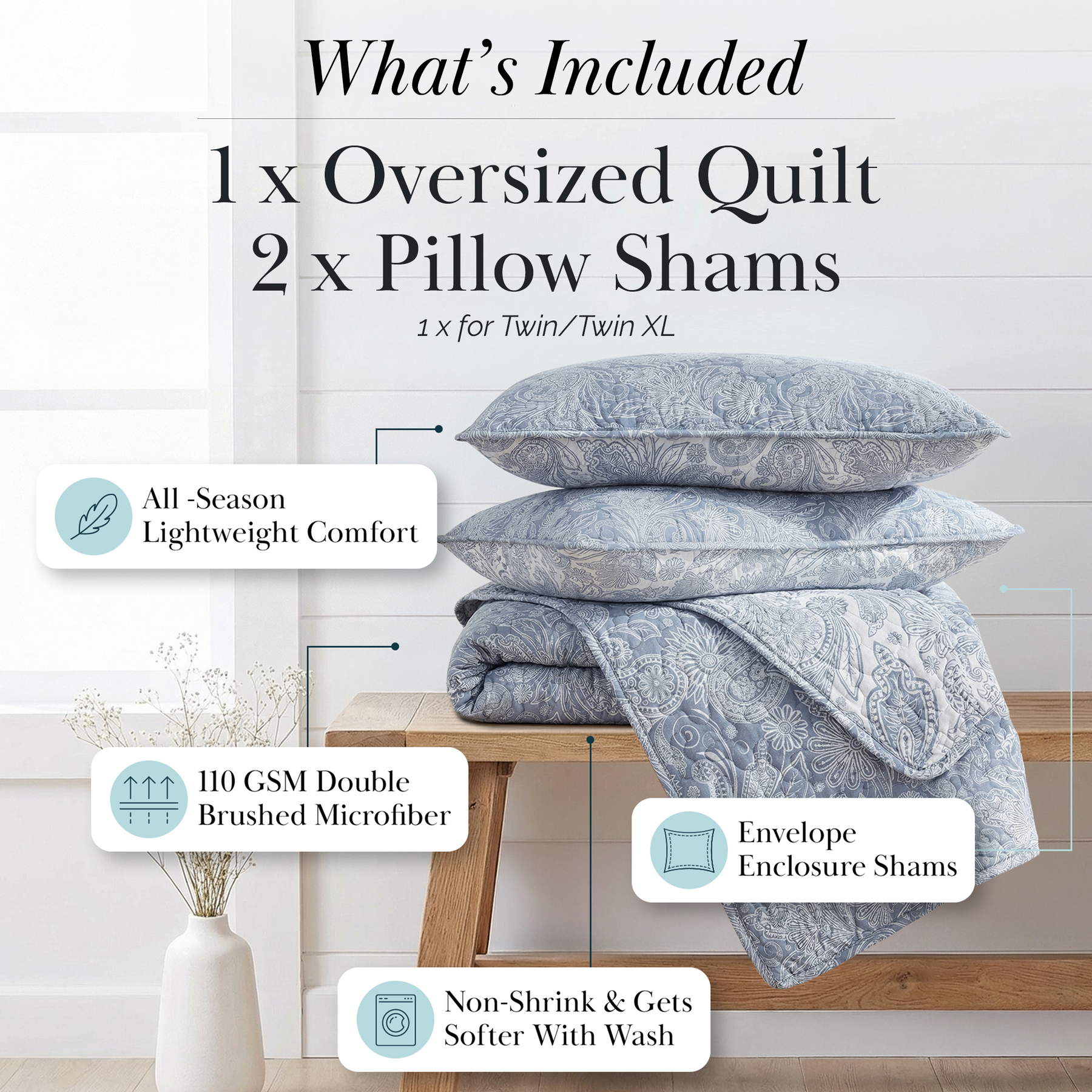These embroidered oversized quilt is light weight and can be used on its own or as a layer on your bed.