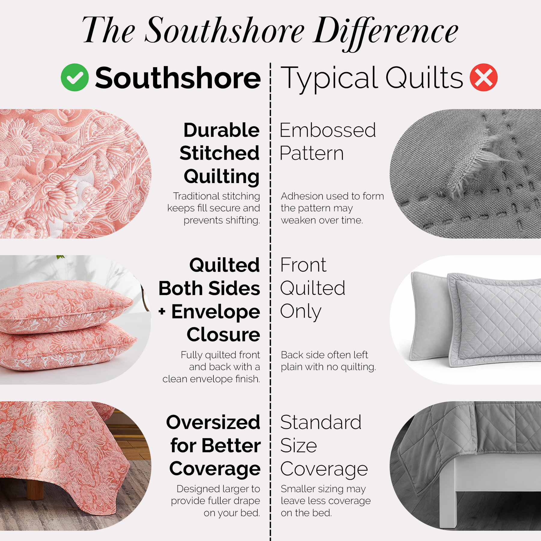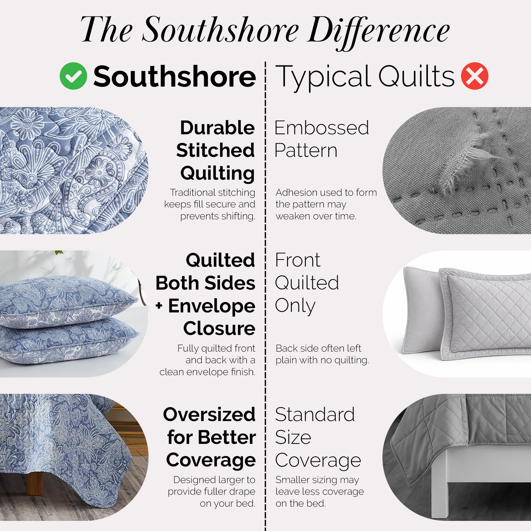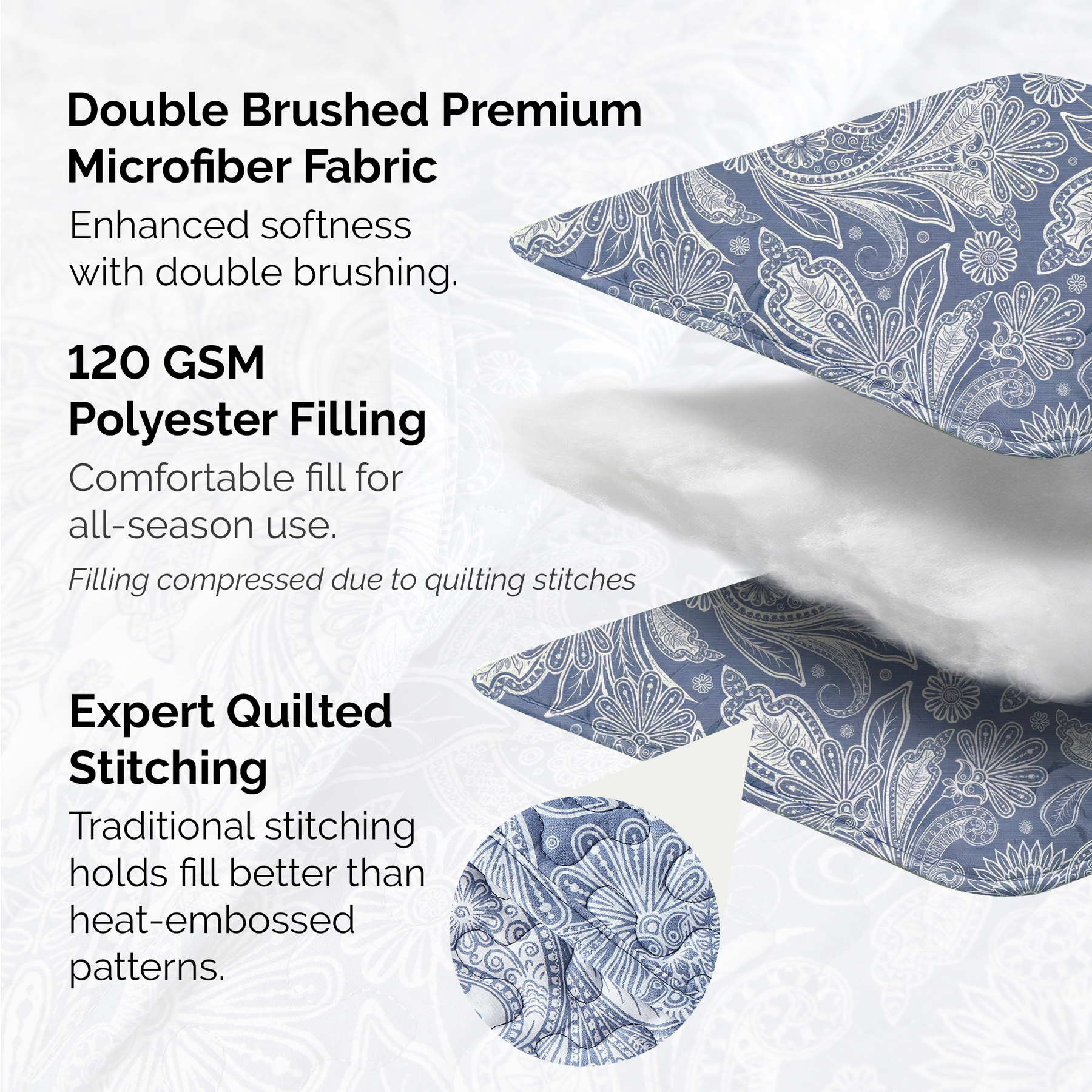 The lightweight, embroidered detail on this quilt is supreme. Ultra soft and comfortable you will sleep tight all night long.