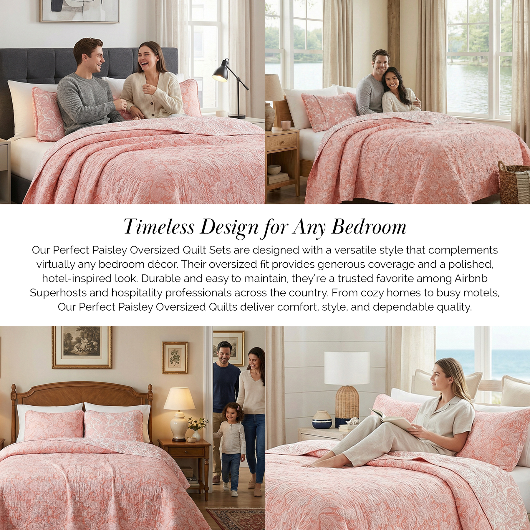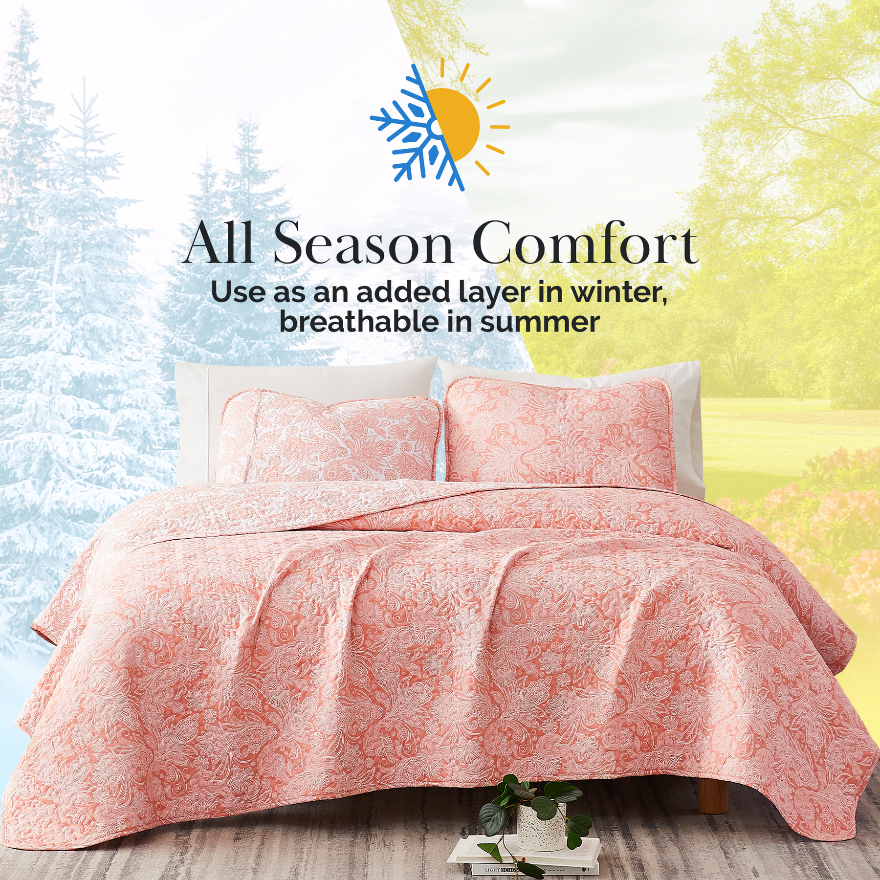 Front View of Perfect Paisley Reversible Quilt Set in Coral